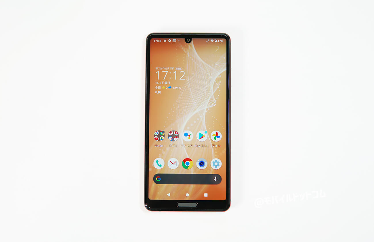ディスプレイサイズは、約5.8インチIGZOディスプレイ、解像度は1,080×2,280(フルHD+)を採用しています。シャープらしい美しいディスプレイで、日常使いで不満が出ることはまずないでしょう。