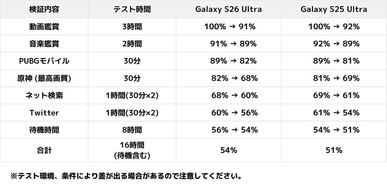 実際の使用シーンを想定し、Galaxy S26 Ultraのバッテリー持ちを確認します。