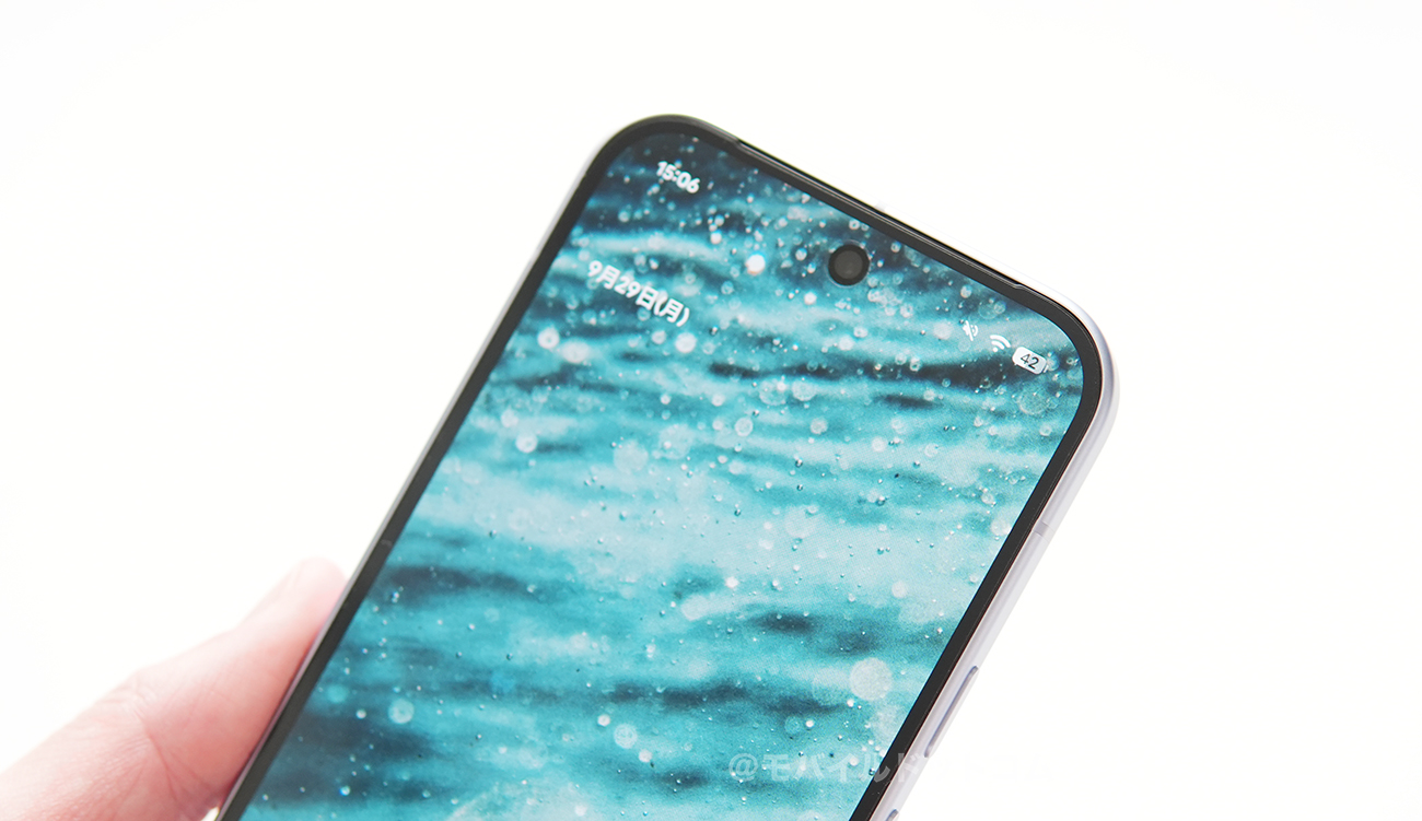 Google Pixel 10は、フラットディスプレイ採用(Corning社のGorilla Glass Victus 2)。上部に、パンチホール型のインカメラ搭載しています。