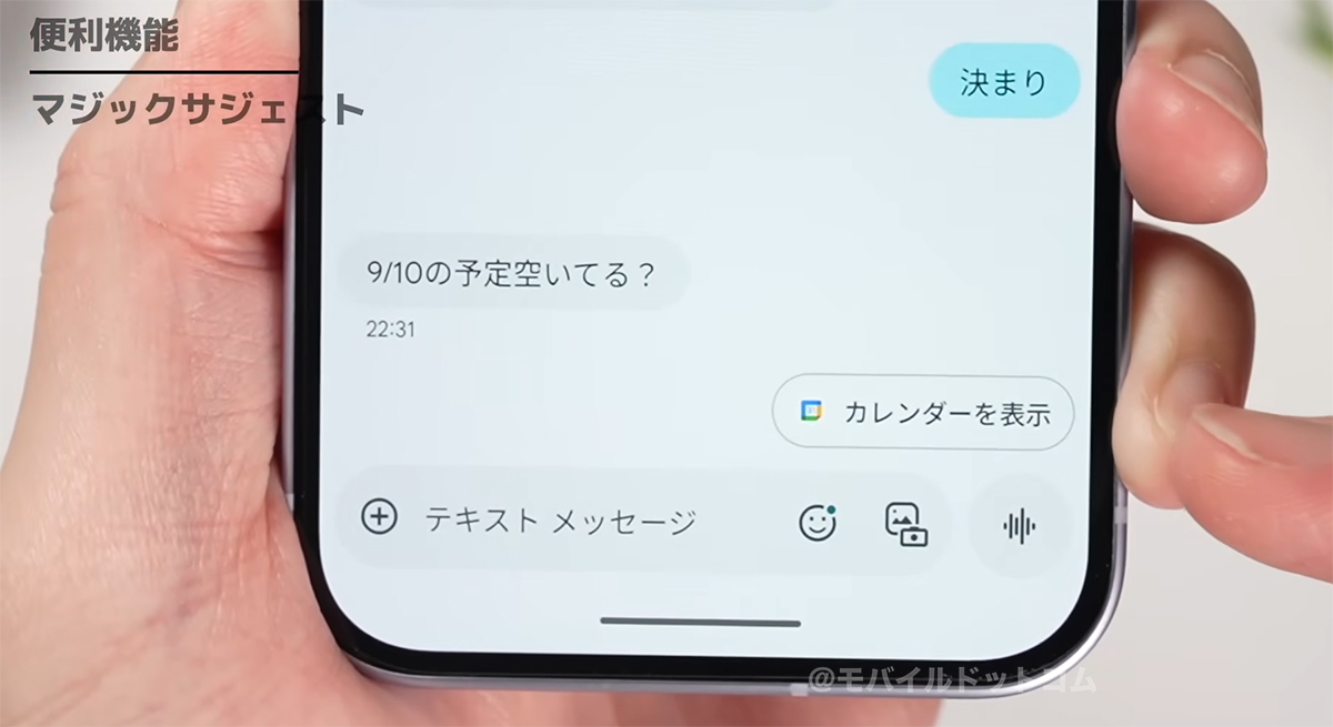 Google Pixel 10で、利用できる新AI機能「マジックサジェスト」。電話やメッセージアプリなどで、AIが先回りして内容にマッチした提案をしてくれて、画面上にカレンダーやマップなどのアプリや情報を表示・提示してくれる機能です。