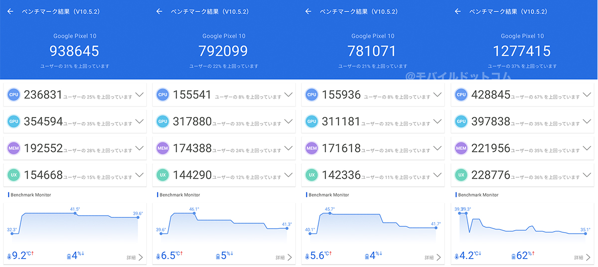 Google Tensor G5搭載「Google Pixel 10」のAntutu Benchmarkスコアは1,277,415点(*検証時のMAXスコア)」。計測時の本体温度は、最大46.1度でした。