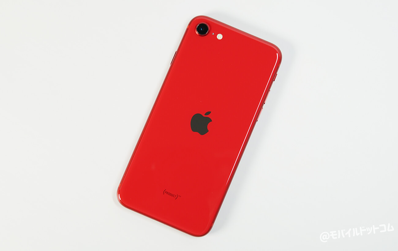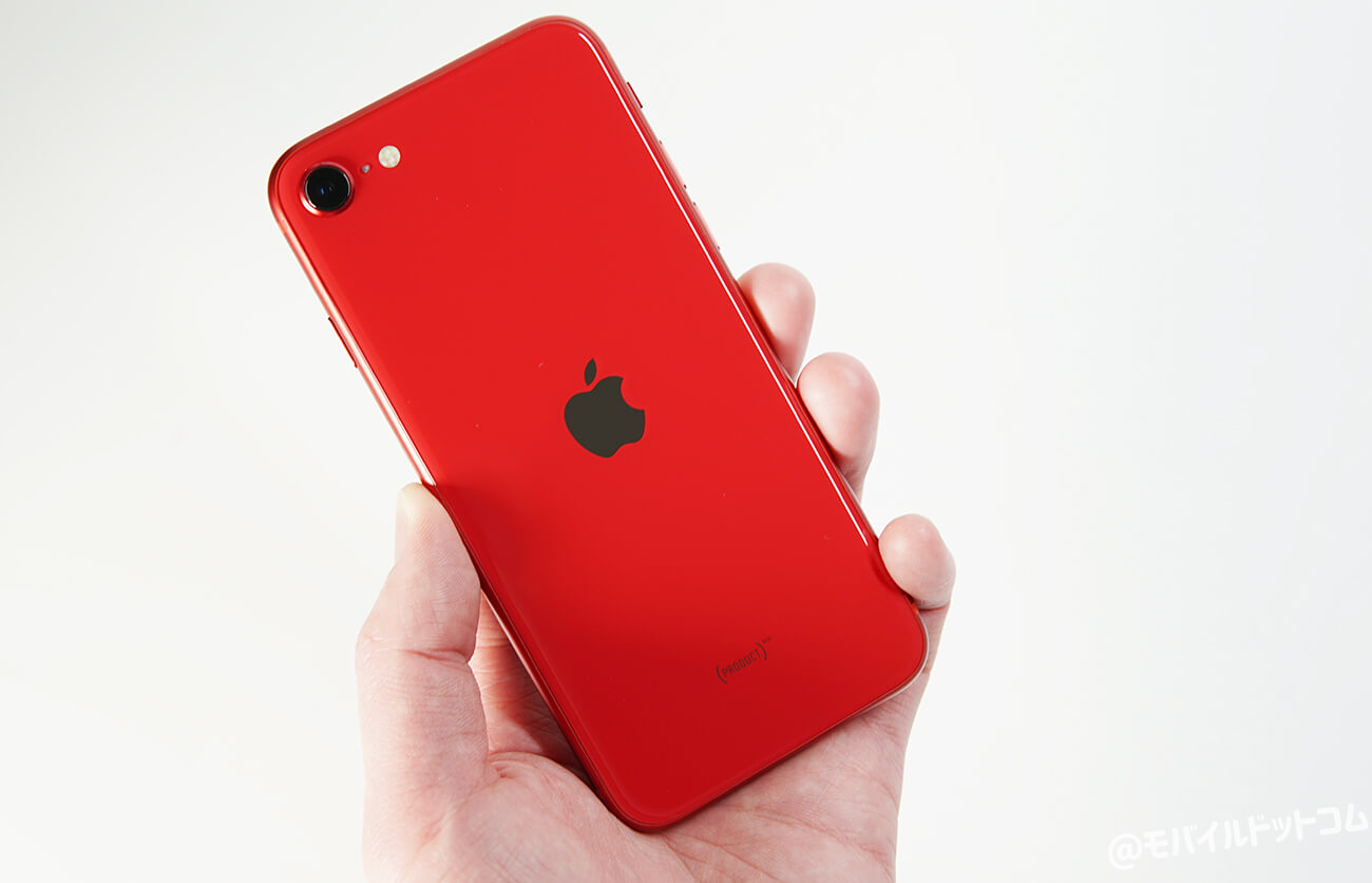 背面デザインは、左上に「シングルカメラ」、中央に「Apple」のロゴ、下部に「(PRODUCT)RED」と刻まれています。